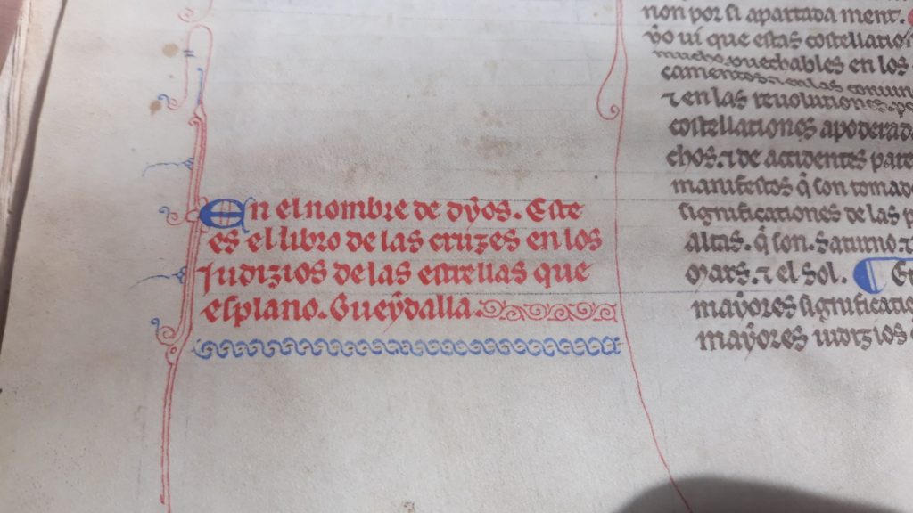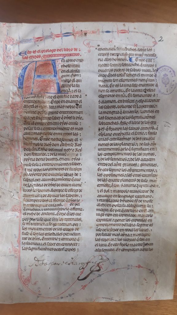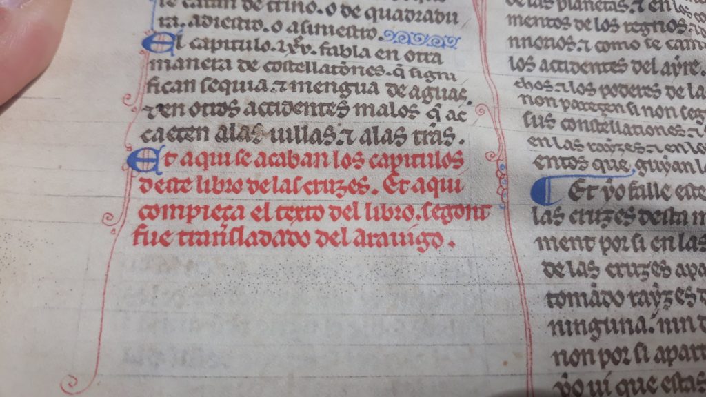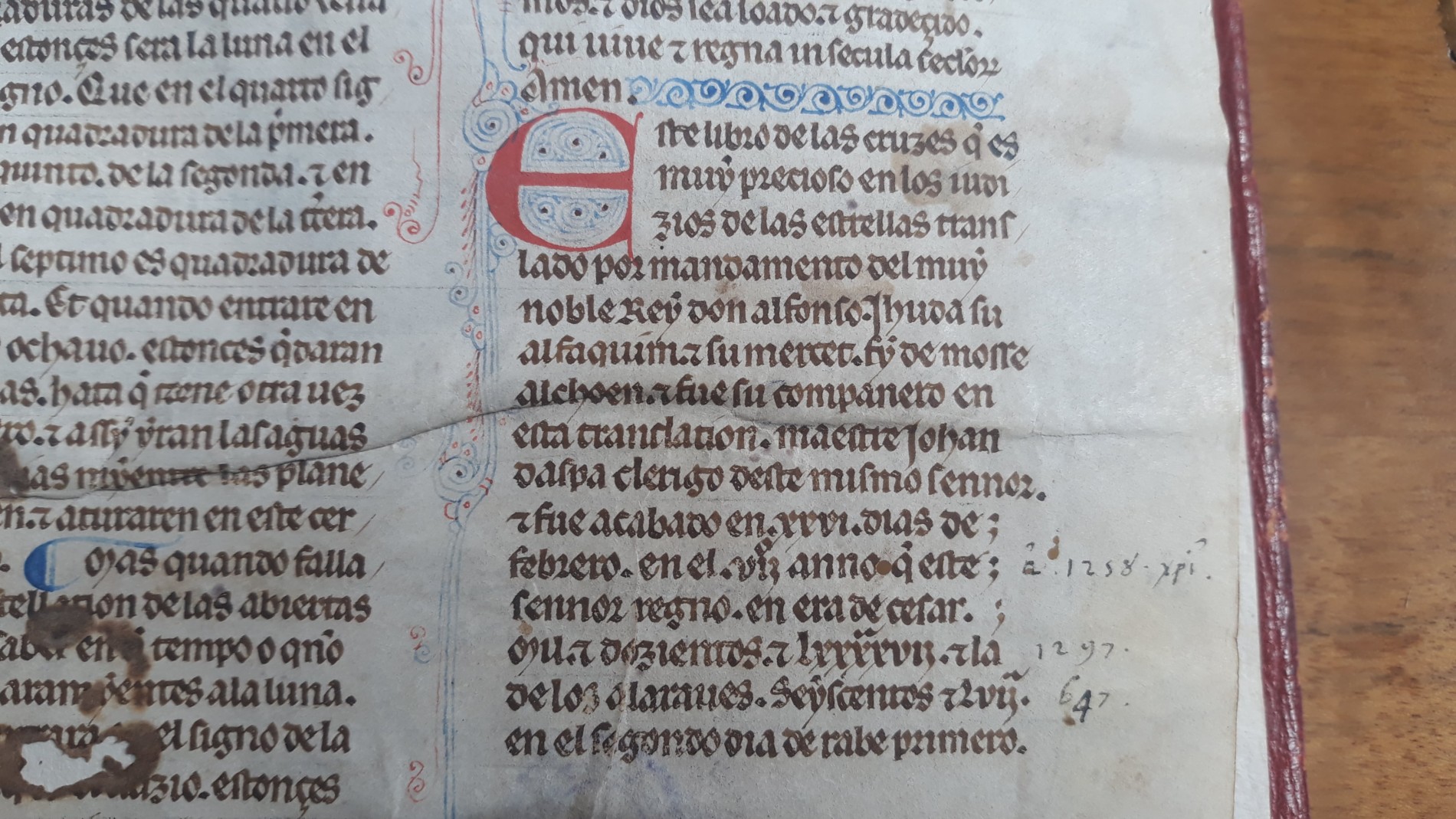 “Este libro de las cruces, que es muy precioso en los juicios de las estrellas, trasladado (traducido) por mandamiento del muy noble rey don Alfonso y Huda su alfaquí, a su merced, hijo de Mosé Alchoen. Y fue su compañero en esta translación Maese Juan D’Aspa, clérigo de este mismo señor. Y fue acabado en 26 días de febrero en el VII año que este señor reinó, en era de César, mil y doscientos y LXXXXVII y la de los alárabes 657 en el segundo día de rabe primero”